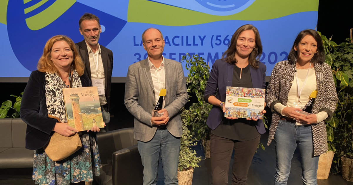 De gauche à droite : Sandrine Pontaven, directrice administrative et commerciale des éditions Locus Solus, Yannick COROLLER du Pays des Abers, Florent Patron, directeur éditorial des éditions Locus Solus, Trifin Le Merdy, éditrice chez Beluga/Coop Breizh, Fanny Cheval, autrice et dessinatrice de Cherche et trouve en Bretagne.