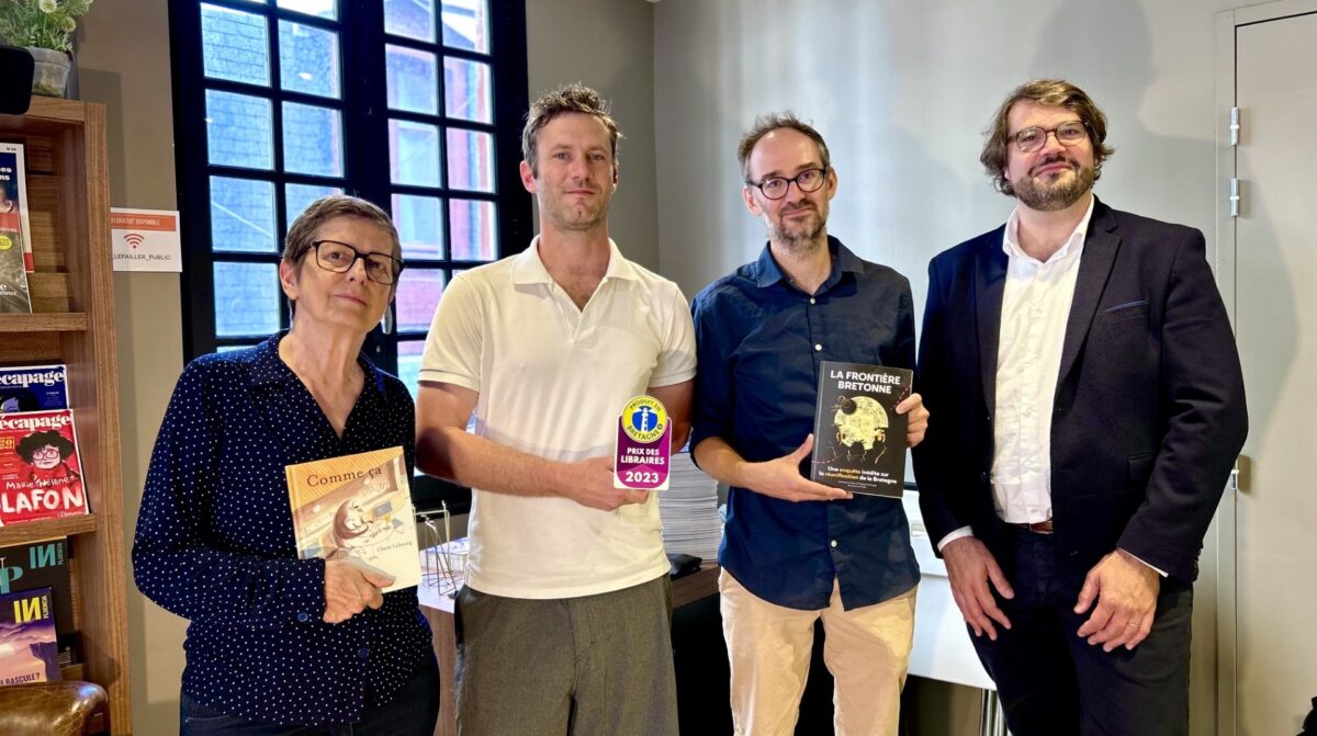 De gauche à droite : Christine Morault, cofondatrice et directrice éditoriale des éditions Memo, Eudes, Benjamin Keltz et Philippe Créange, co-auteurs de la Frontière bretonne.