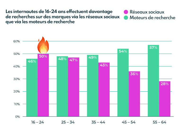 Comme le présente le visuel ci-dessous, les réseaux sociaux sont devenus des espaces incontournables pour les marques, notamment dans une logique de recherche.