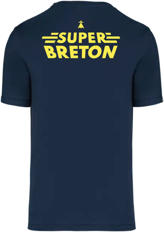 Avec ce T-shirt homme, 100% coton bio, de couleur bleue, arborez fièrement votre attachement à la Bretagne ! Soyez vous aussi un super breton, avec le logo Produit en Bretagne au cœur et l’inscription super breton, au dos.
